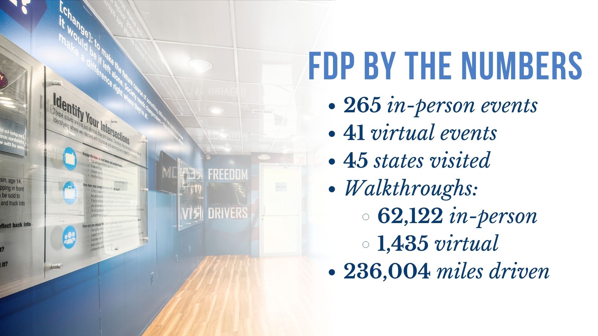 The Freedom Drivers Project (FDP) is a first-of-its-kind mobile exhibit that is a premiere tool in educating members of the trucking industry and general public about the realities of domestic sex trafficking and how the trucking industry is combating it. From its outside wrap, to the climate controlled interior, which includes a theatre station, actual artifacts from trafficking cases that connect people to the back stories of so many who end up enslaved in our country, to portraits of the real Truckers Against Trafficking and how each is working to end human trafficking, this trailer provides many with their first glimpse into human trafficking, as well as simple action steps anyone can take immediately walking out of it.